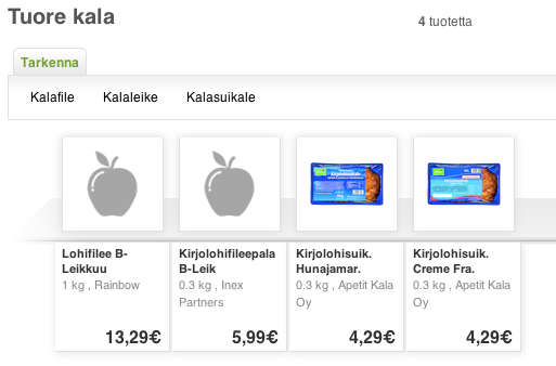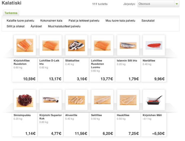 Viimeinen kohde oli Ruoka.net. Siellä tuorekalaa ei valitettavasti ollut saatavilla. Savulohta toki löytyi.