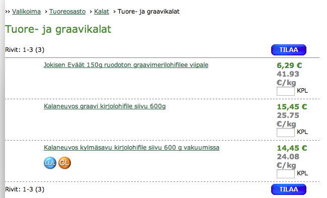 Viimeinen kohde oli Ruoka.net. Siellä tuorekalaa ei valitettavasti ollut saatavilla. Savulohta toki löytyi.
