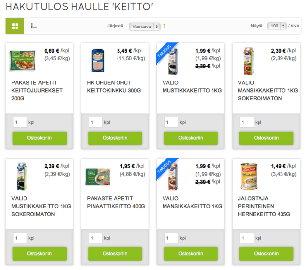 Hakutoiminto tuo tuloksiin turhaa sälää, esim. hakusana ”keitto” antaa ilman lajittelua kaikki tuotteet missä kyseinen sana esiintyy, kuten keittokinkku ja keittojuurekset. Halutun tuotteen löytäminen hakutulosten sekamelskasta on työlästä.