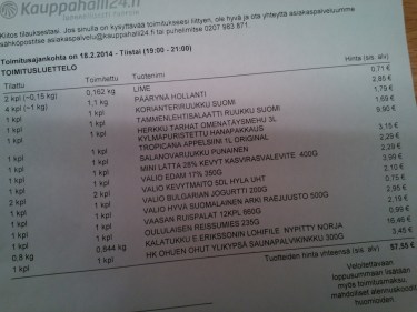 Ruuan tilaaminen Kauppahalli24:stä oli suomalaiseksi verkkokaupaksi yllättävän sujuvaa. Herääkin kysymys, miten noin pieni narikka pystyy sujuvasti pyörittämään verkkokauppaa samalla, kun suuri osa suomalaisista verkkokaupoista olisi parempi sulkea kokonaan, kunnes karseimmat puutteet on korjattu. Onnittelut Kauppahallin väelle! Kauppahalli ei yllä käytettävyydessä Alepan tasolle, mutta toimii riittävän hyvin.