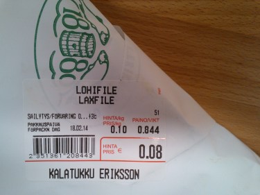 Nimi ”Erikssonin Kalatukku” kalan kääreessä antaa vaikutelman, että kala on tuoreempaa kuin marketin tiskillä. Pyyntipäivää ei tosin kerrottu.