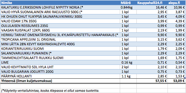 Taulukosta näkyy viikko sitten tehty hintavertailu kahden nettikaupan välillä. Muutamassa kohdassa samaa tuotetta ei löytynyt molemmista kaupoista, silloin vertailuun valittiin mahdollisimman lähellä oleva vastaava tuote.