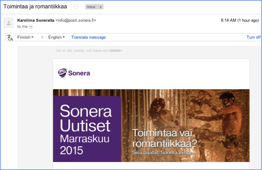 Kuka Karoliina sitten on? Tätä minulle ei kerrottu. Avattuani sähköpostin, ylhäällä oli otsikko ”Sonera Uutiset, Marraskuu 2015”. Sen alla oli standardin mukaiset kolme mainosmoduulia.