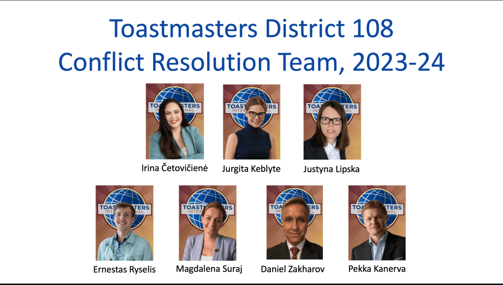 The organization is called Toastmasters International, and I’ve had the privilege to lead the Conflict Resolution Team at the organization’s fantastic District 108 comprising seven countries: Poland, Estonia, Latvia, Lithuania, Finland, Russia and Kazakhstan.