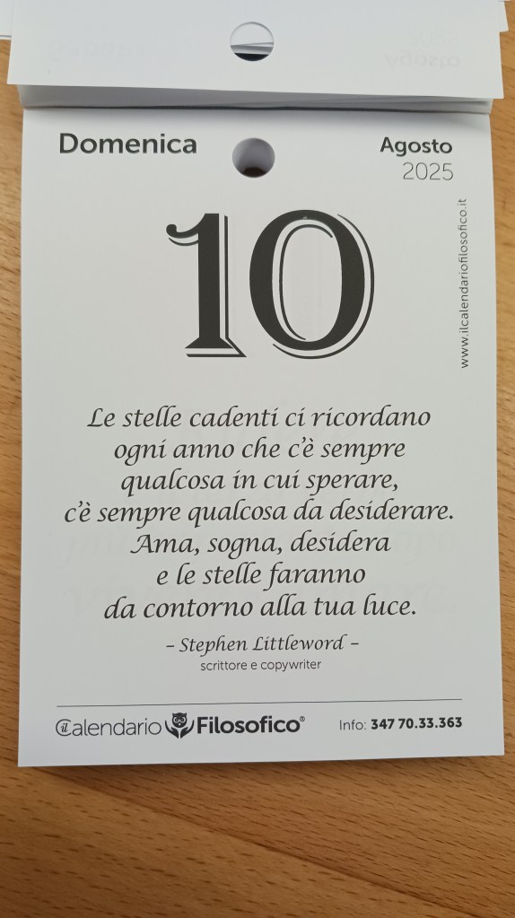 ”Le stelle cadenti ci ricordano ogni anno che c’è seumpre qualcosa in cui sperare, c’è sempre qualcosa da desiderare. Ama, sogna, desidera e ele stelle faranno da contorno alla tua luce.”